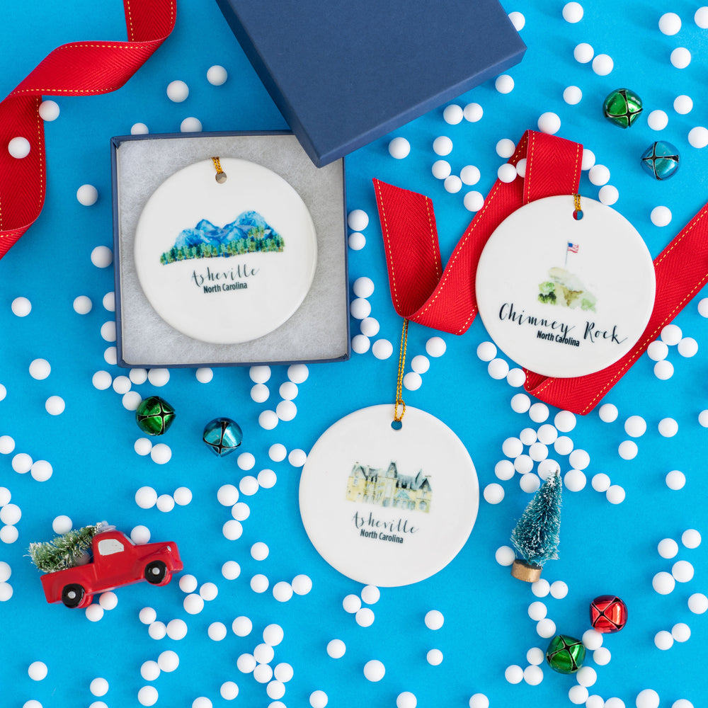 This Asheville Christmas Ornament can be personalized just for you or ordered as shown. Historic Biltmore scene on a pretty white ceramic ornament makes a perfect holiday keepsake or gift.