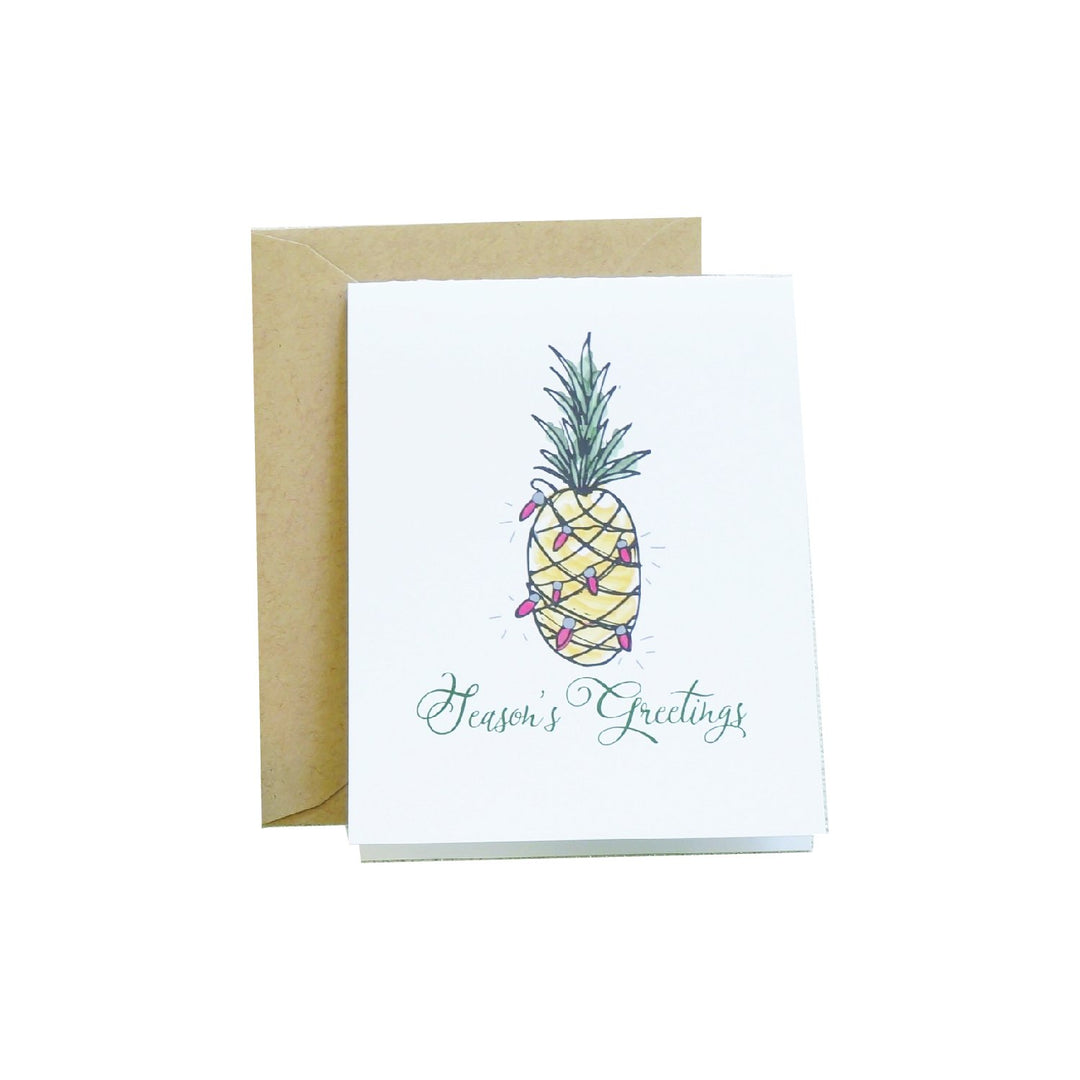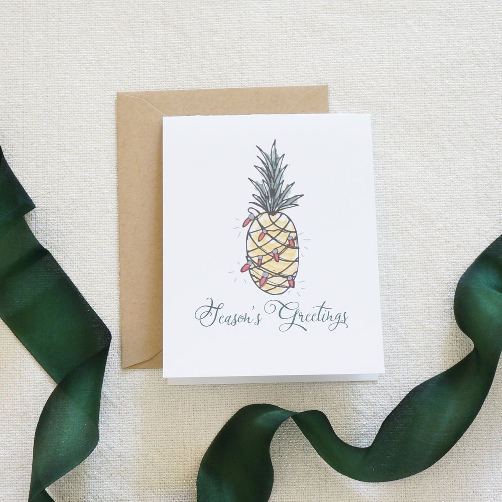 Original watercolor art of a pineapple wrapped in Christmas lights adorn this "Season's Greetings" card. It's perfect to send to everyone on your list!