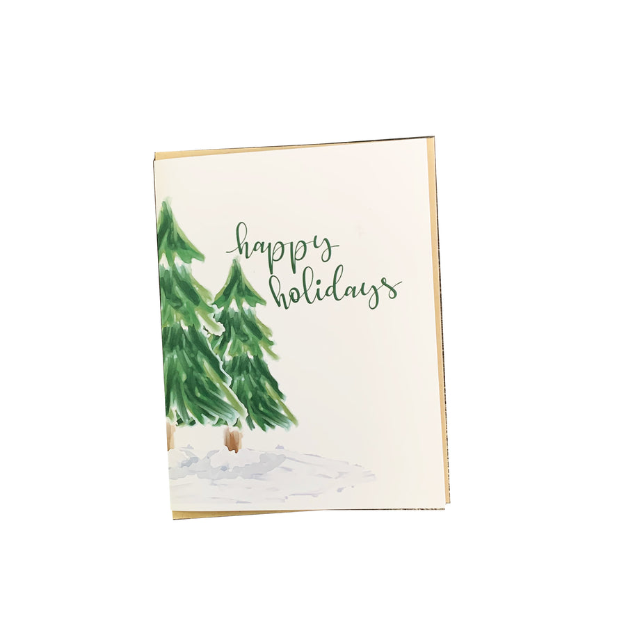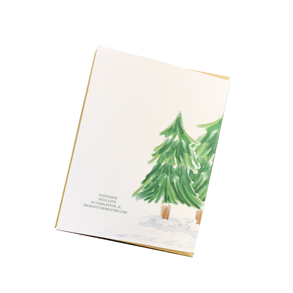 This sweet Christmas card design features a woodland style design with a Christmas tree grove. It's the perfect sweet holiday card to send to friends and family!