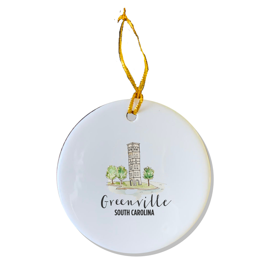 This Greenville Christmas Ornament can be personalized just for you or ordered as shown. The Furman Bell Tower scene on a pretty white ceramic ornament makes a perfect holiday keepsake or gift.
