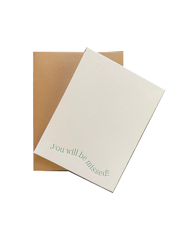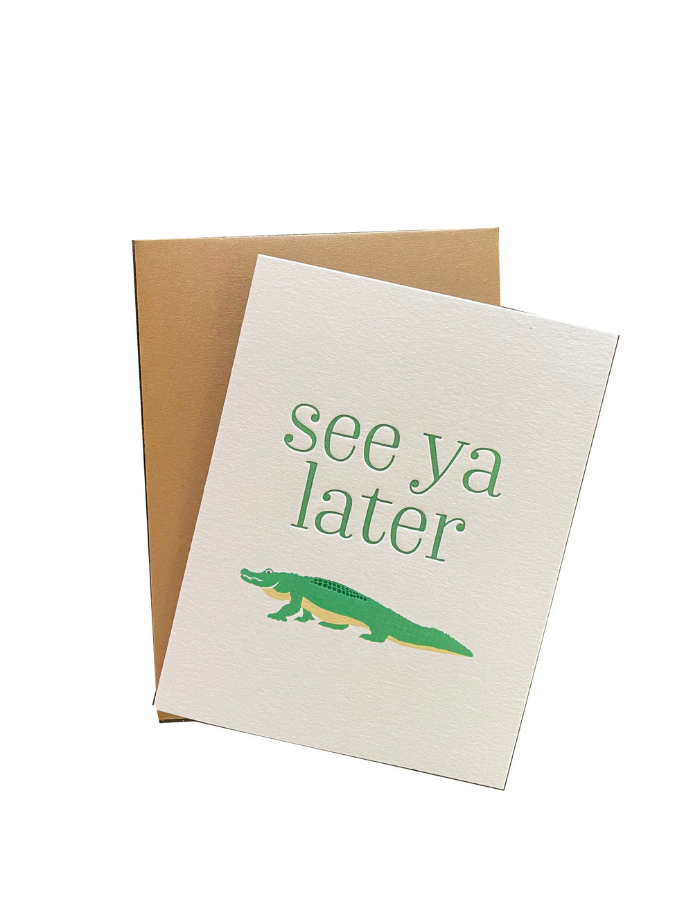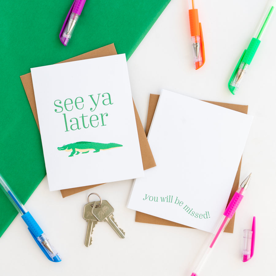 This is the cutest moving away card for a friend or family member! The front has a sweet alligator design and on the back of the card it says "You will be missed." Sure to put a smile on the recipient's face!