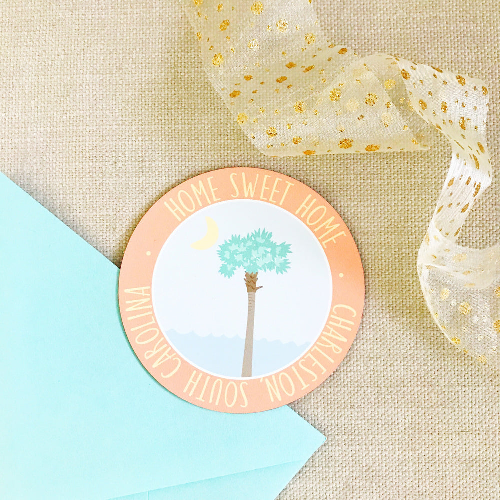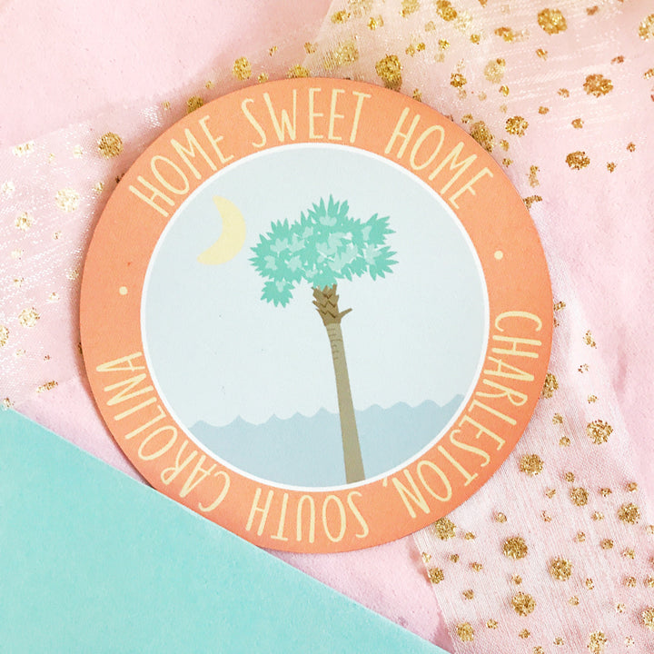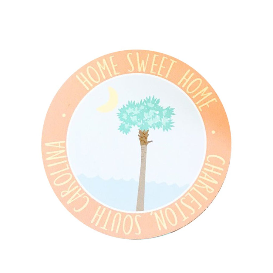 Adorable 3" round magnet with a sweet palm tree image and "Home Sweet Home, Charleston SC" message. Pair with some of our other Charleston items to create a special gift for a friend - especially one moving to the Holy City!