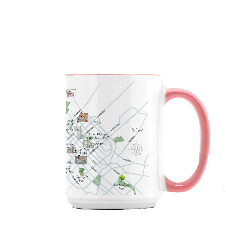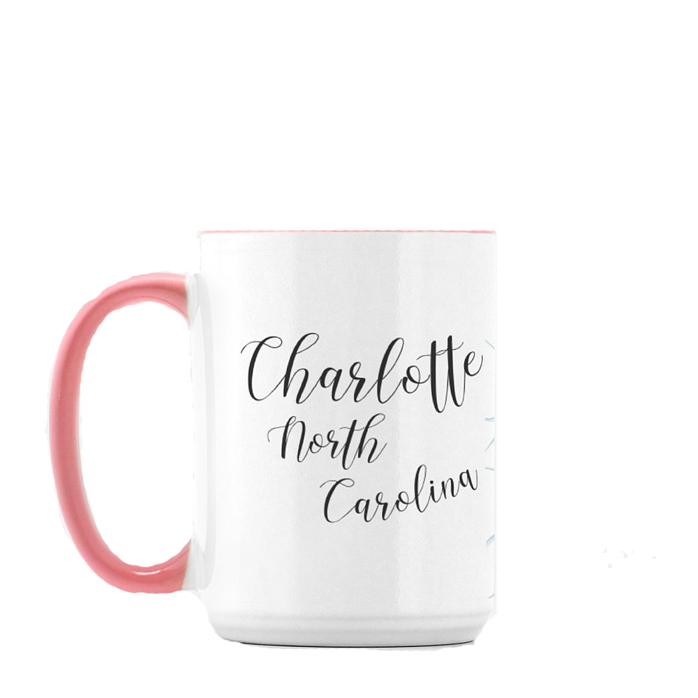 Deluxe coffee mug with white ceramic exterior and pretty pink handle and interior.  Design is a beautiful airy watercolor map of Charlotte.  A wonderful gift idea or special treat for oneself!