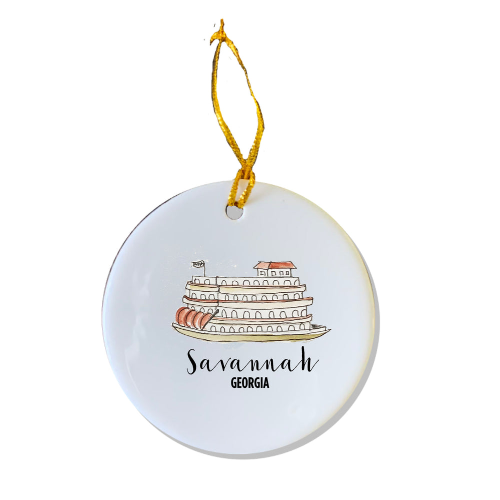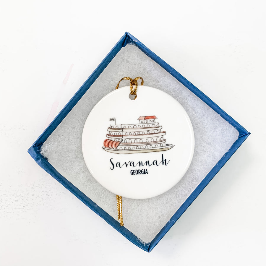 It's hard to visit Savannah without noticing the iconic riverboats like the Georgia Queen! Beautiful Savannah scene on a frosted glass ornament makes a perfect holiday keepsake or gift.
