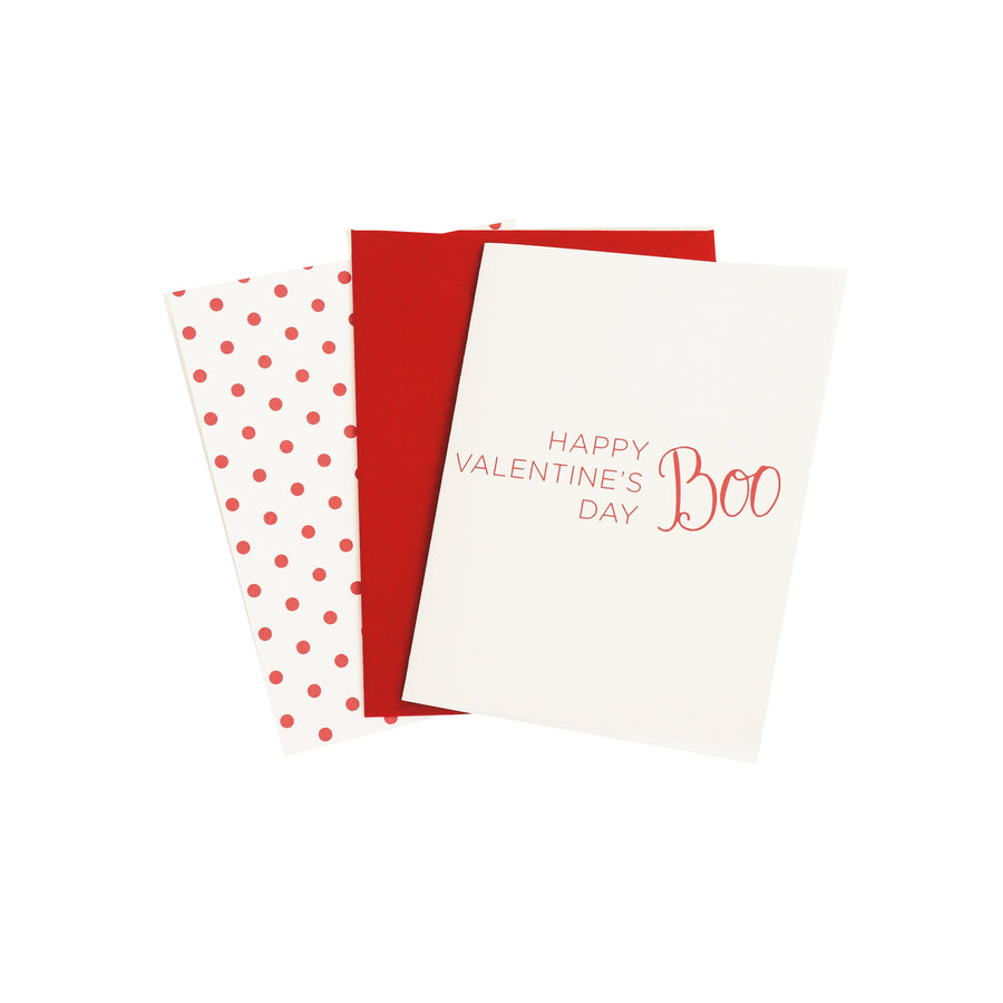 A combination of clean modern type with hand calligraphy, the message on the front reads "happy valentine's day, boo!" and the inside of the card is blank. On the back, adorable red polka dots add a fun touch and the card is paired with a pretty red envelope.